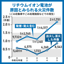 リチウムイオン電池の混ざった一般ごみから出火し、消防隊等によって消火されたケースは、令和4年度(2022年度)が4,260件だったのに対し、令和5年度(2023年度)は8,543件と倍増しています。(リチウムイオン電池、誤った捨て方で火災に! | 政府広報オンライン より)